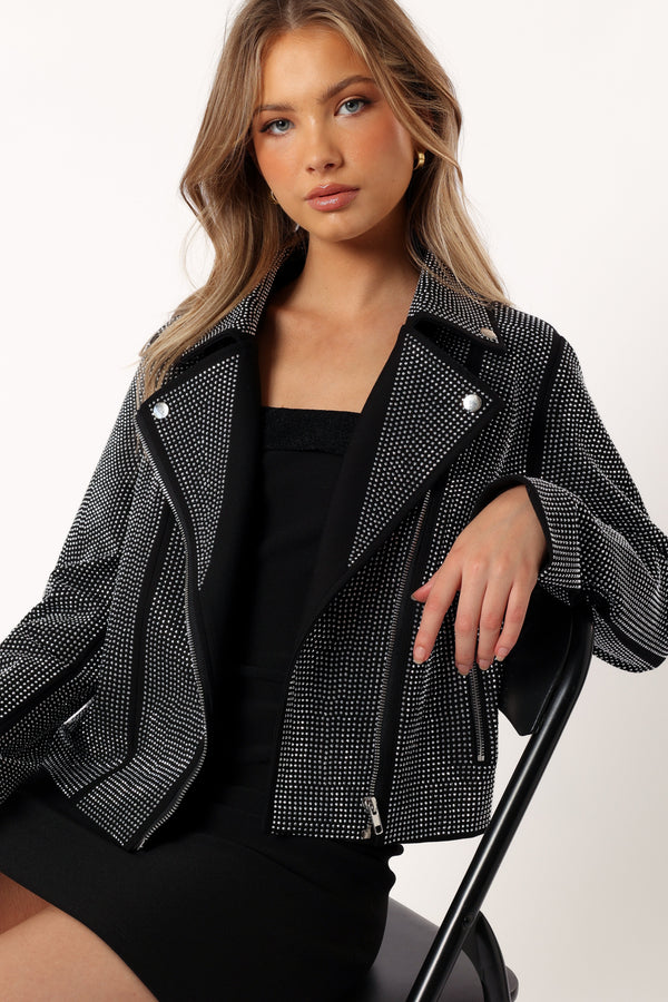 This season, make a statement with this crystal studded jacket! This collared jacket features long sleeves and a front zip close that adds to the overall look. It also comes with functional front pockets for convenience.
