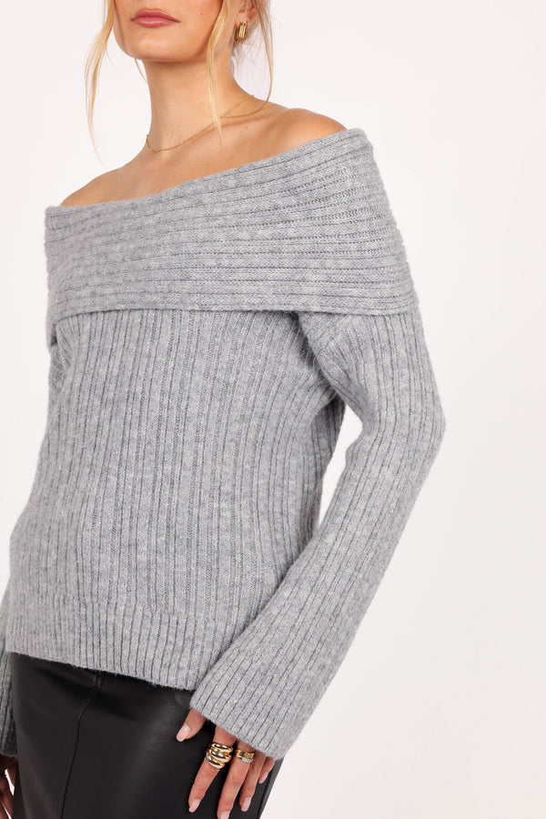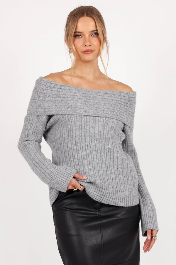 Experience the perfect blend of comfort and style with the Kenny Off Shoulder Knit Sweater in Grey. Designed with a straight fold-over neckline, this sweater offers a touch of elegance while maintaining a casual vibe.