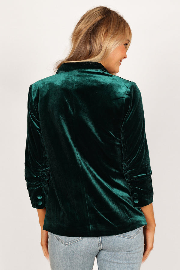 Elevate your wardrobe with the Vera Velvet Blazer in Green, the piece that transforms any outfit from ordinary to extraordinary. This stunning blazer features a sophisticated collared design with classic lapels that frame your face beautifully, while the luxurious velvet-feel material catches the light with every movement.
